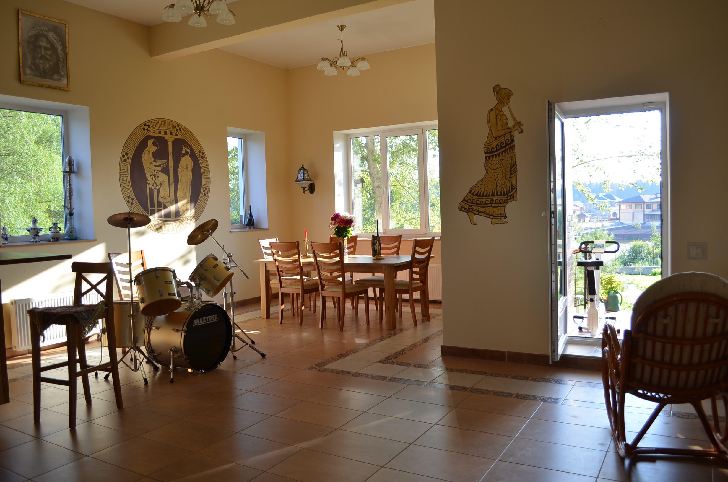 1-й этаж: кухня-столовая-гостиная с мраморным камином - высота потолка 4 м, с выходом на веранду с внешним камином - барбекю, гостевой с/у, спальня с ванной, холл, чулан, котельная с отд. входом, гараж.