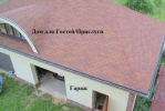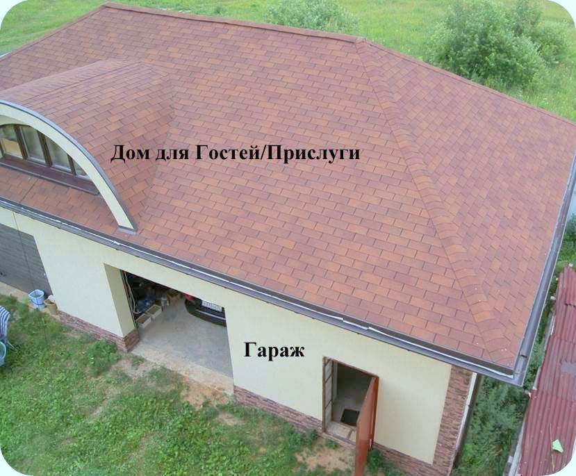 На участке гараж: 220 м2 (на 3 машины) с жилым мансардным этажом.
