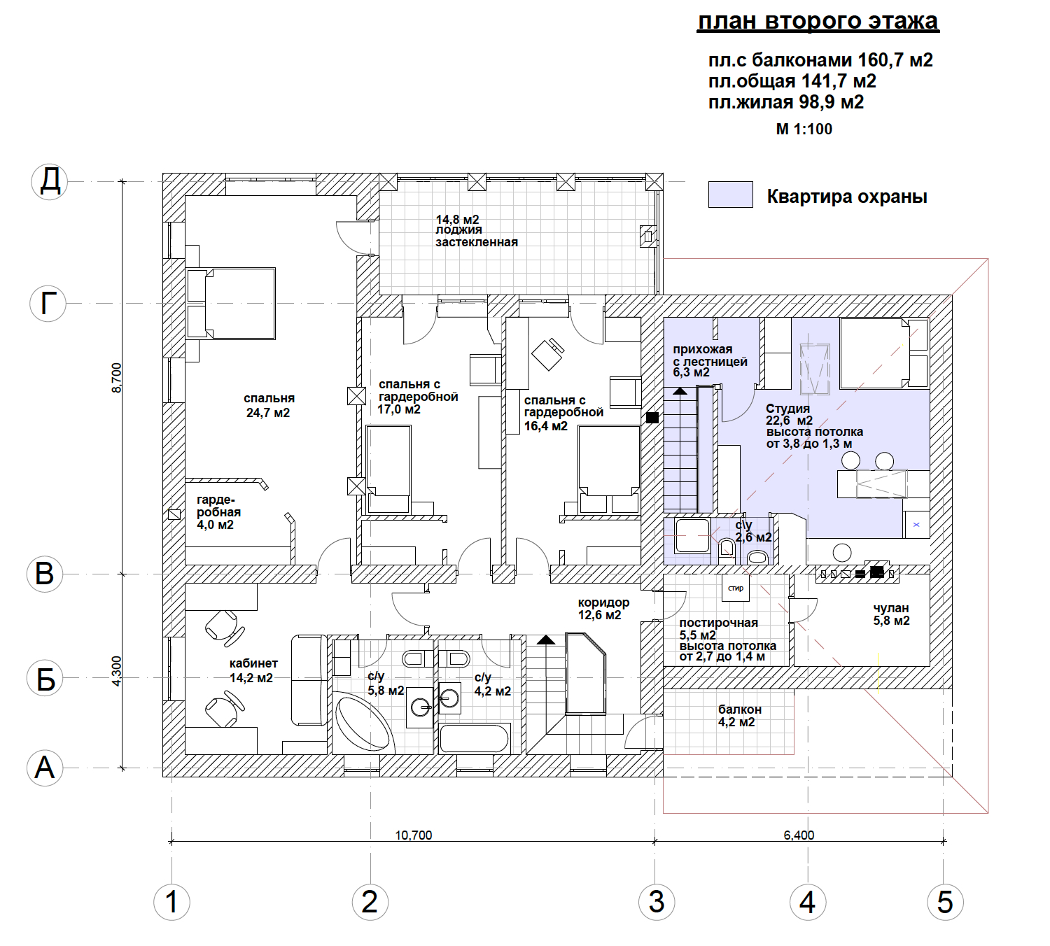 2-й этаж: хозяйская часть: спальня с гардеробной + ванная + кабинет, две детские спальни с гардеробными, детская ванная, лоджия - все спальни выходят на лоджию, постирочная, чулан, балкон .