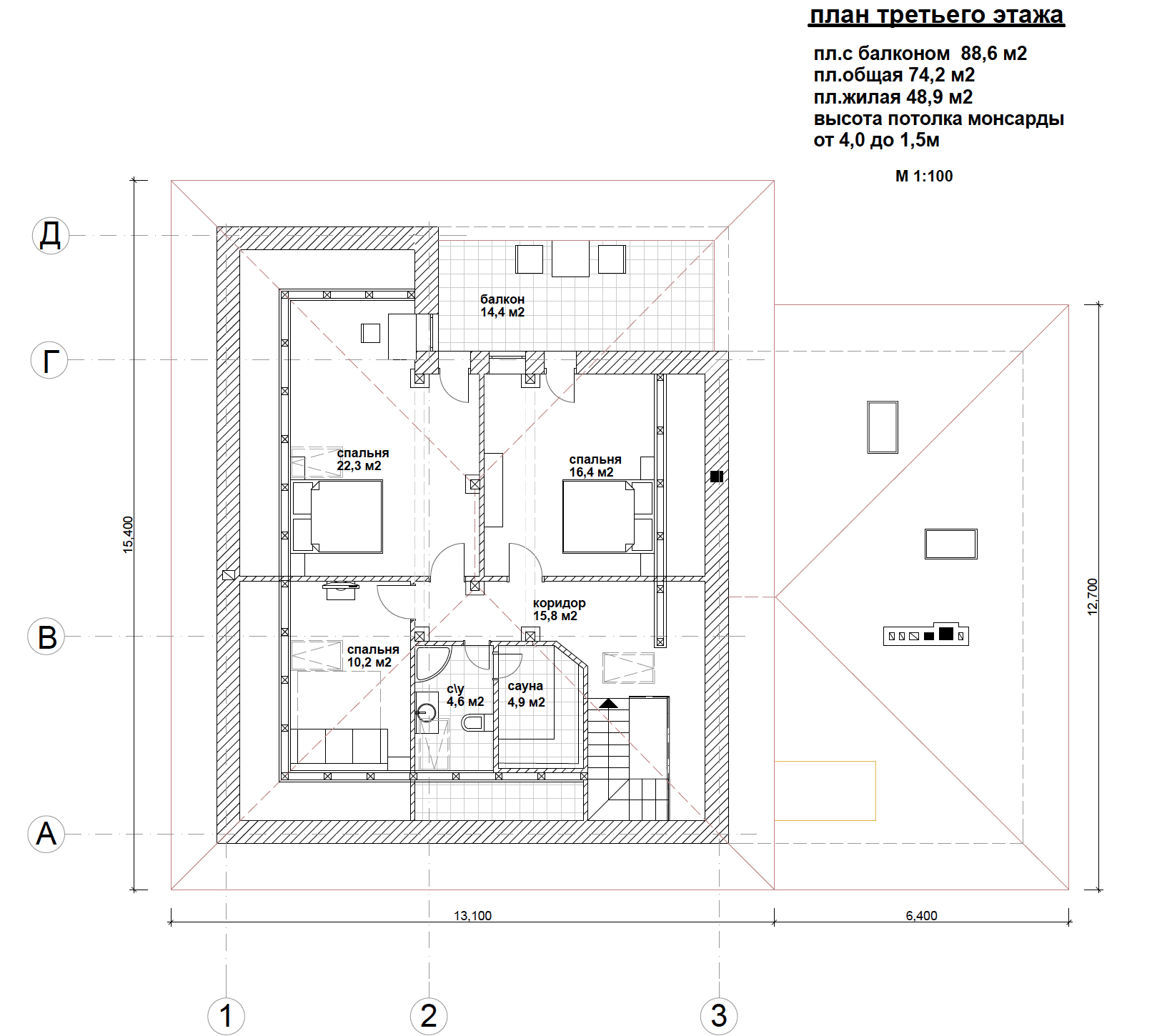 З-й мансардный этаж: две спальни с выходом на большой крытый балкон, комната отдыха, с/у.