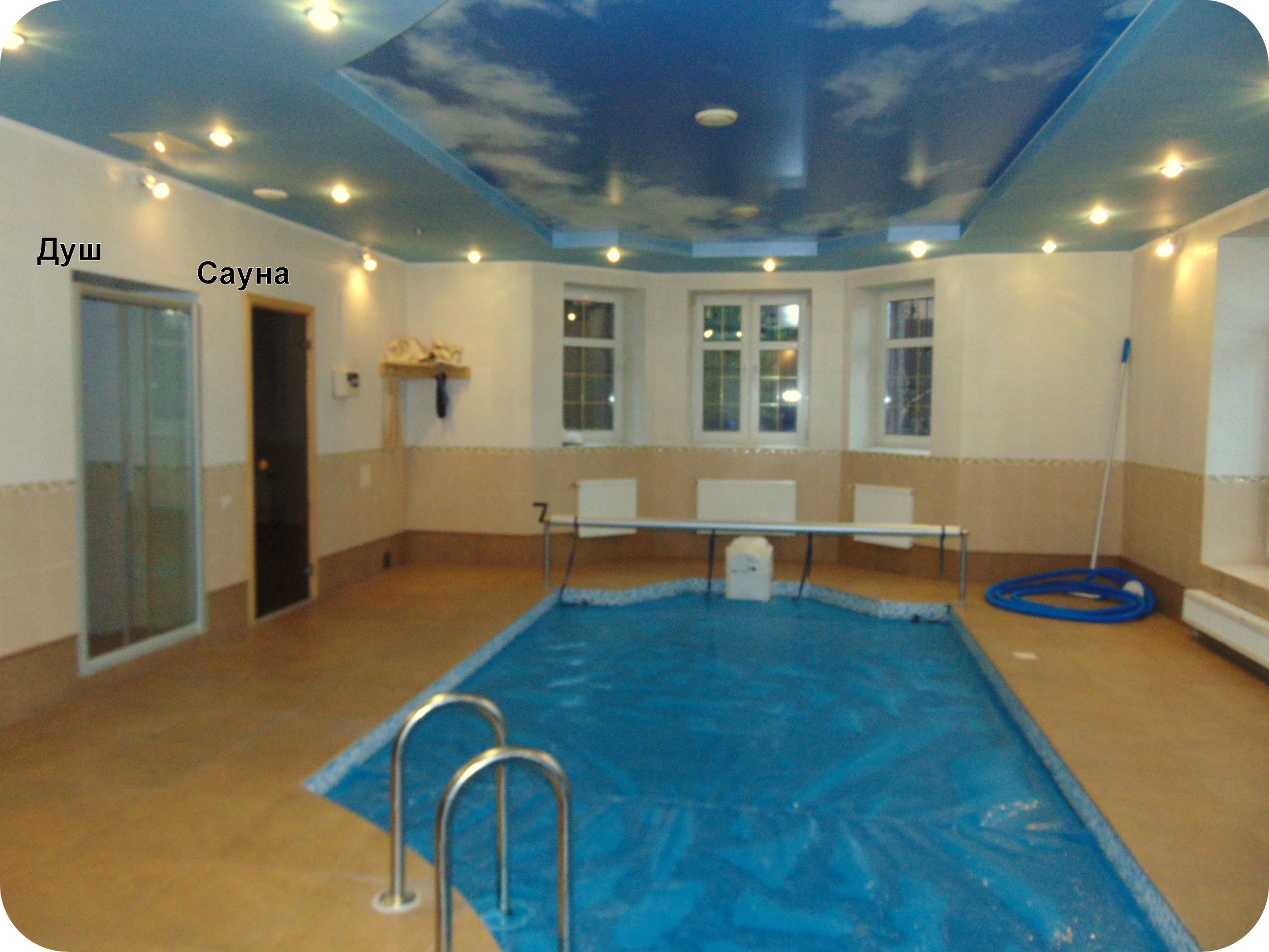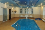Цокольный этаж: зал с бассейном(57 м2), сауна(5 м2), санузел, душевая, комната отдыха(32 м2), кладовая 6 м2, котельная.