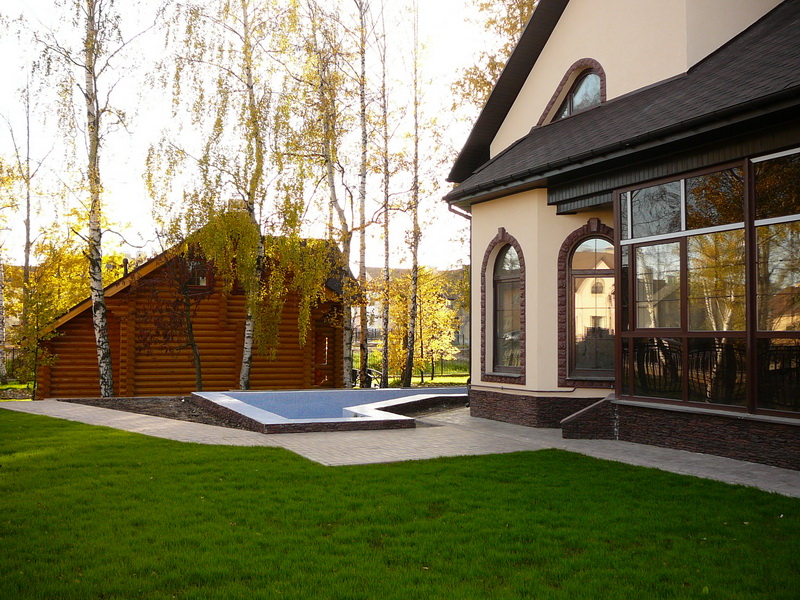 К домам ведут бетонные дорожки с въездом в гараж.