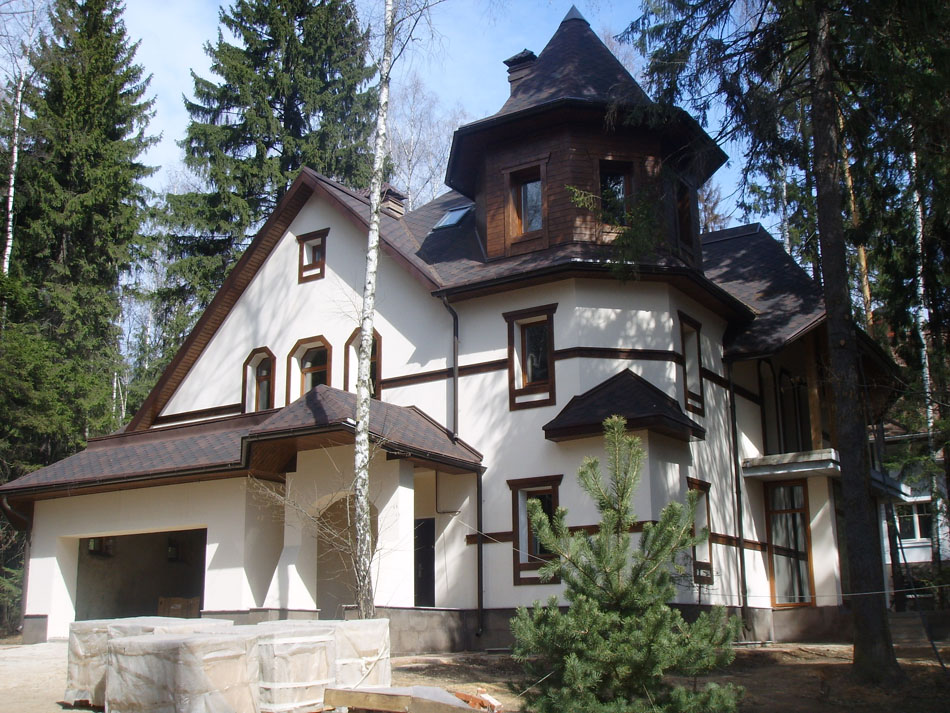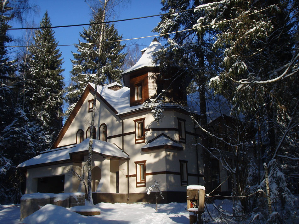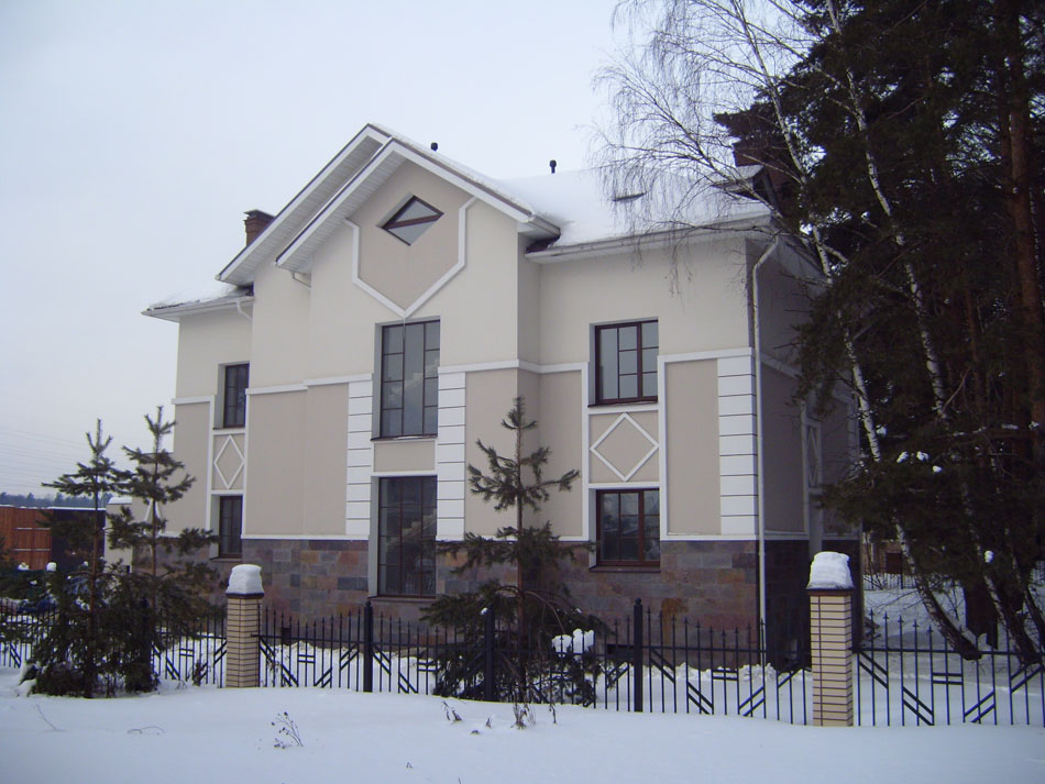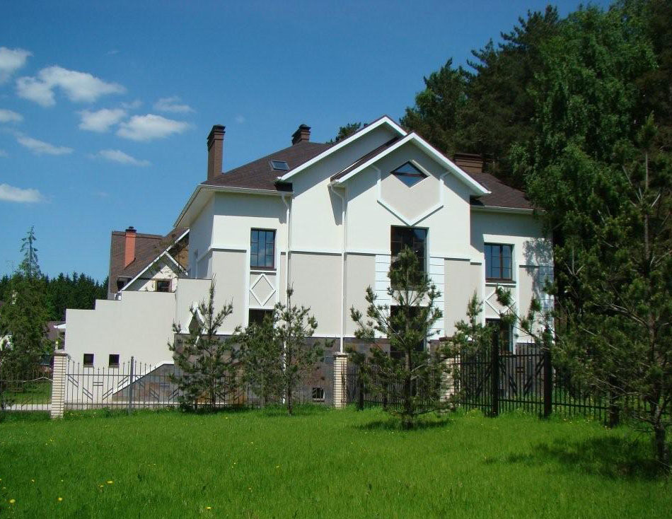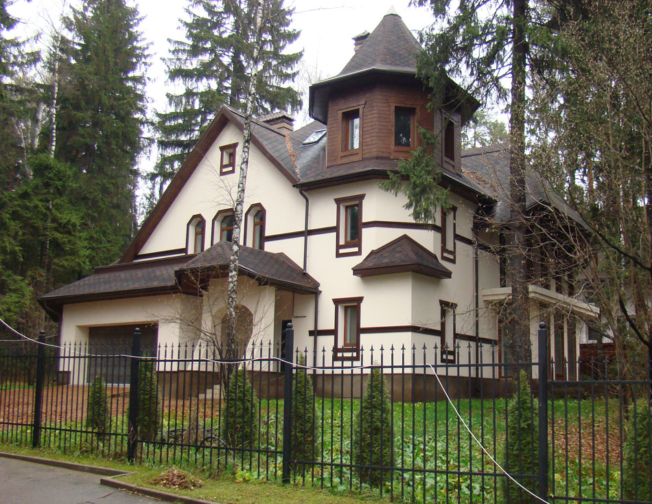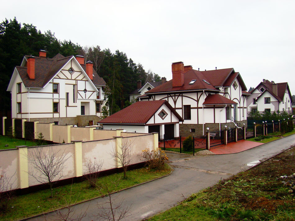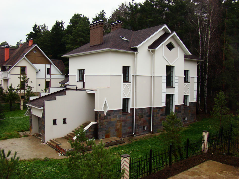 Весь комплекс домов выглядит гармонично. Он - детище архитектора О.К.Терентьевой. Постройки выглядят как единый ансамбль и ненавязчиво вписываются в окружающий природный ландшафт. Фасады отделаны высококачественными неповторимыми материалами: камень, гранит, сорта деревьев, отличающиеся высокой прочностью.