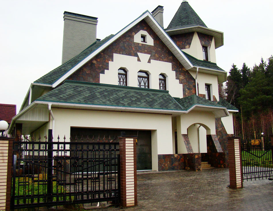 Если дом с гаражом, то он укомплектован воротами. Проезд вымощен плиткой.